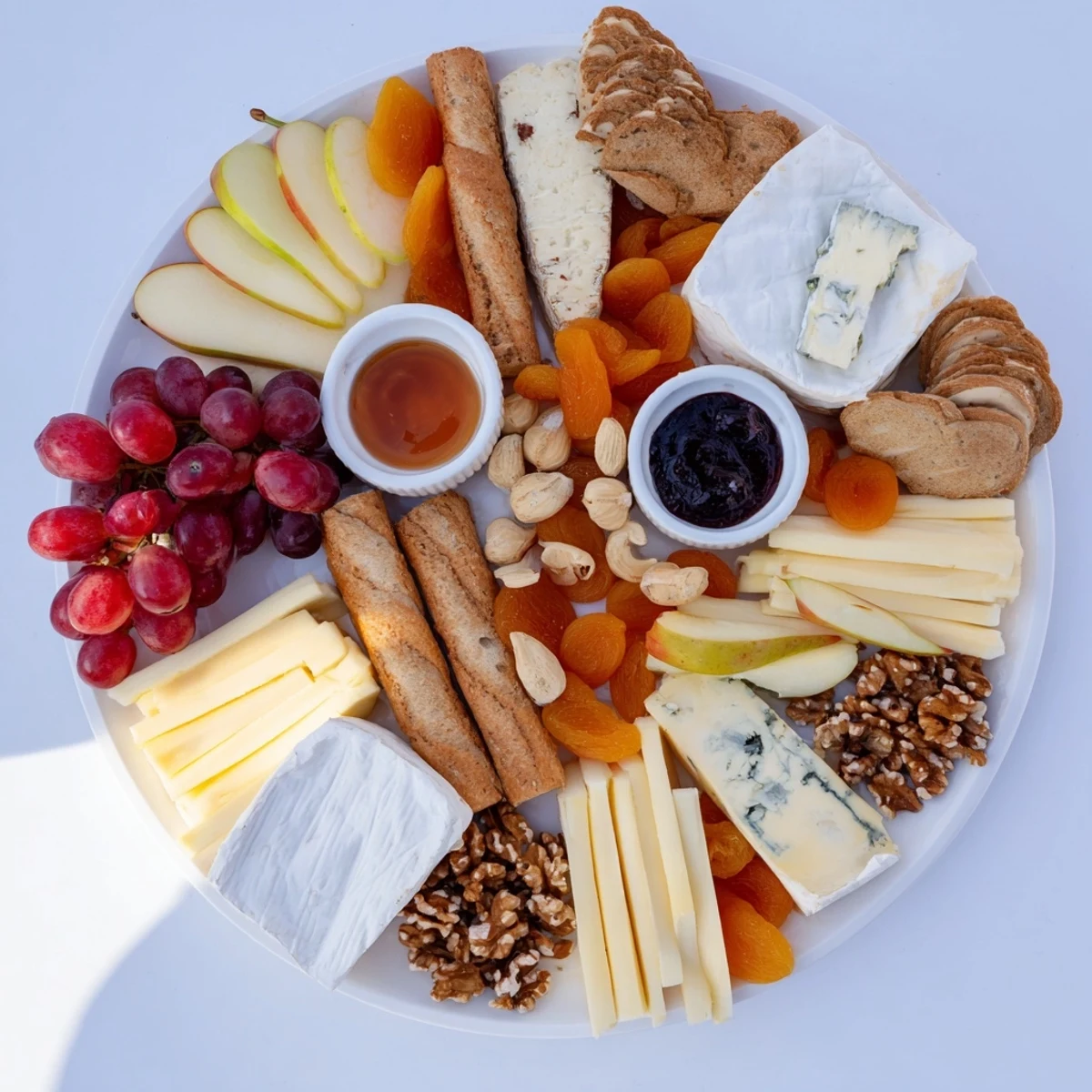 - Fruits: 1 bunch red grapes, 1 pear thinly sliced, 1 apple thinly sliced, 8 10 dried apricots, 8 10 dried figs