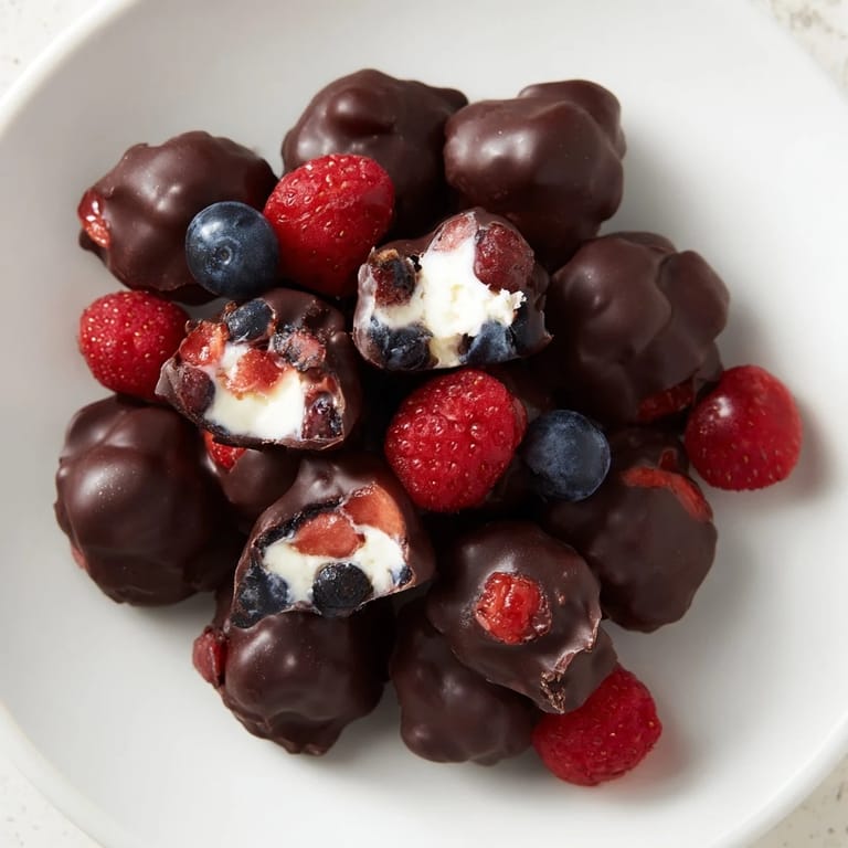 Pin it One summer afternoon, my cousin showed up with a bag of Greek yogurt she couldn't finish before her trip, and I was tasked with creative rescue mission. I'd seen those fancy yogurt bark videos online but wanted something you could actually grab with your hands, something that felt like dessert without the guilt. Two hours later, I was biting into these chocolate-coated clusters that tasted like a frozen berry dream, and suddenly that forgotten yogurt became the star of the show.