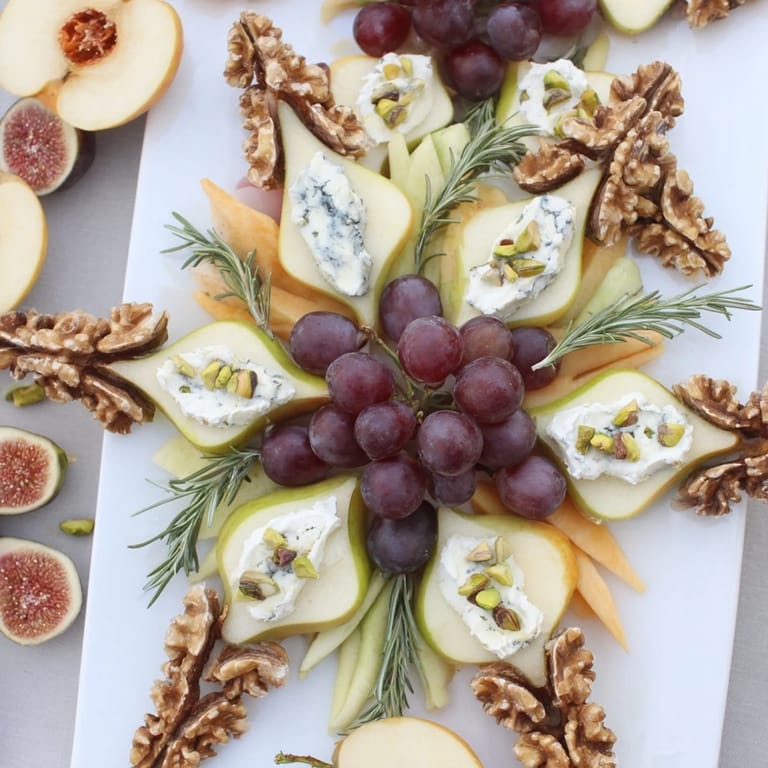 - Arrange the quartered figs and walnut halves in alternating points to form a star shape on a large serving board or platter.
