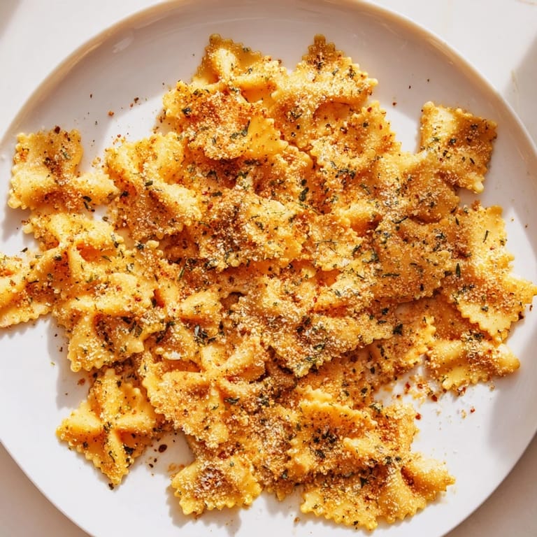 Pin it Crispy baked pasta chips tossed with a flavorful blend of seasonings, perfect for snacking or serving with dips.