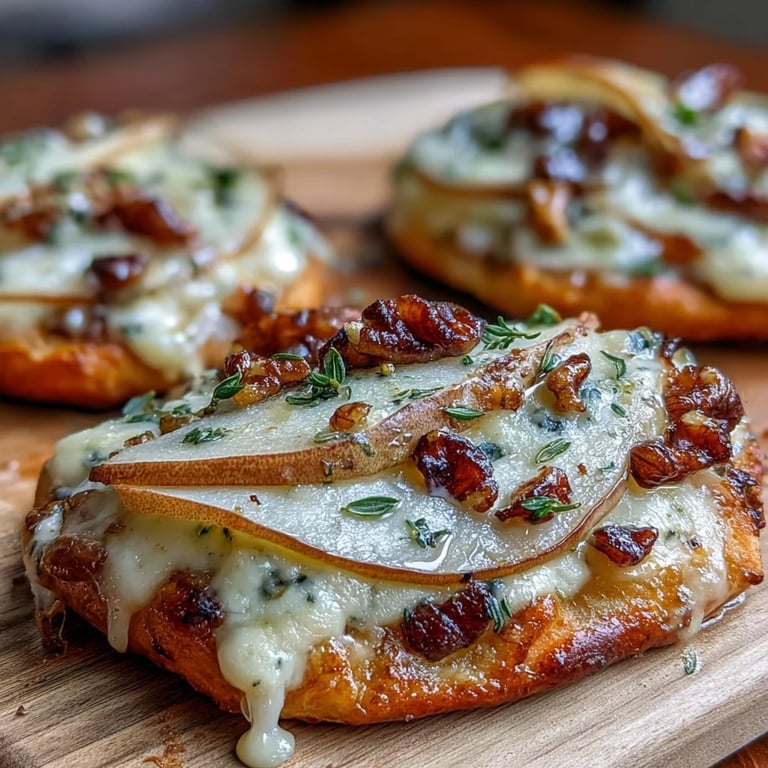 These elegant pizzettes combine the sweetness of ripe pears with the bold creaminess of Gorgonzola cheese and the tangy complexity of pickled walnuts. Baked on crisp golden dough and finished with fresh thyme, they make an impressive appetizer that's surprisingly easy to prepare. Ready in just 35 minutes, these Italian-inspired bites are perfect for entertaining and pair beautifully with crisp white wine.
