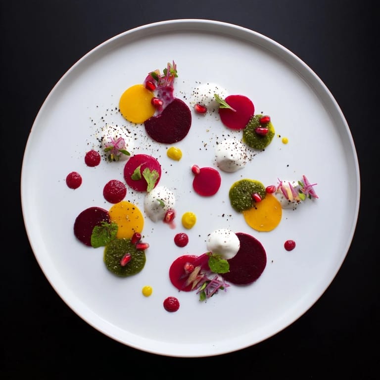 I remember my friend Sarah sitting at my table, fork hovering over her plate, eyes wide with wonder. She took one small bite combining the beet puree with the microgreens and pomegranate, then another mixing the yellow pepper with basil pesto, and I watched her discover something magical—that this dish wasn't about following a single flavor journey, but about writing her own story with each forkful.