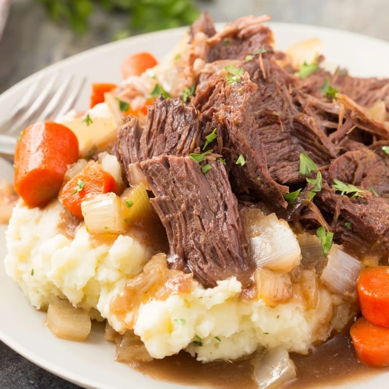 Pin it With just a few simple ingredients and minimal hands-on time, this slow cooker pot roast lets the flavors develop slowly, ensuring a juicy and tender result every time. The accompanying mashed potatoes provide a smooth, luscious base that pairs beautifully with the savory roast and vegetables, making each bite a rich combination of textures and tastes.