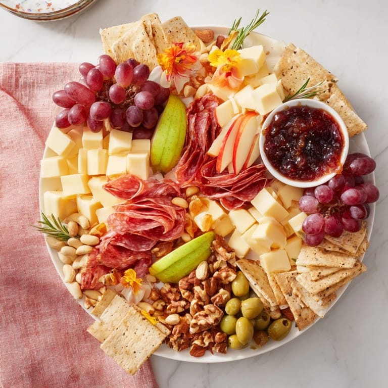 - Nuts & Condiments: ½ cup roasted almonds ½ cup walnuts ¼ cup green olives ¼ cup fig jam or honey