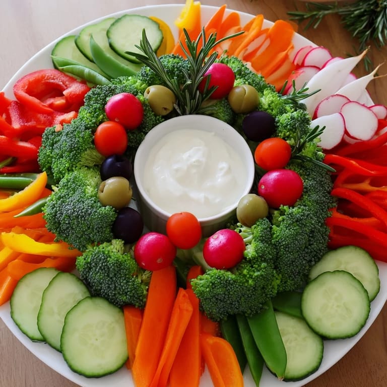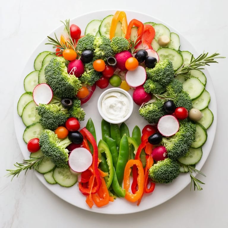 Pin it A festive and eye-catching vegetable platter arranged in the shape of a holiday wreath, served with a creamy ranch dip. Perfect for parties and gatherings.