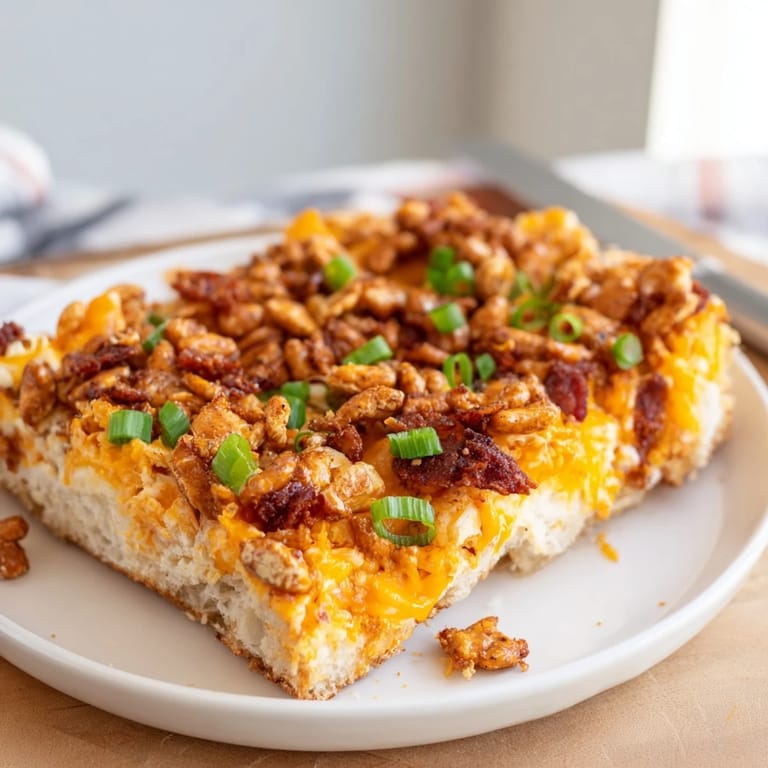 Pin it Buttery, flaky biscuit bars layered with tangy buffalo sauce, creamy ranch, and a crunchy pretzel topping are perfect for game day or a savory snack.