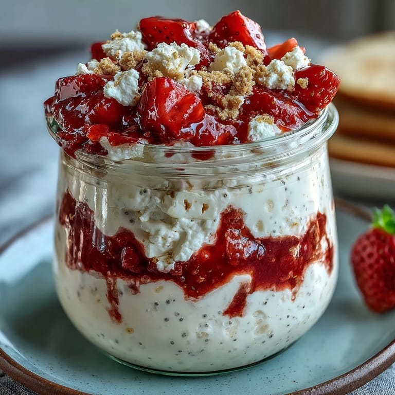 Pin it Last Tuesday morning, I stood in front of my open fridge staring at a container of cottage cheese that needed using, and strawberries sitting in their final days before turning soft. Instead of tossing them, something clicked—what if I treated overnight oats like an actual cheesecake and layered them properly? By the time I poured everything into a mason jar and set it on the shelf, I'd created something that felt less like breakfast and more like dessert masquerading as nutrition. That first spoonful the next morning proved the experiment was worth it.