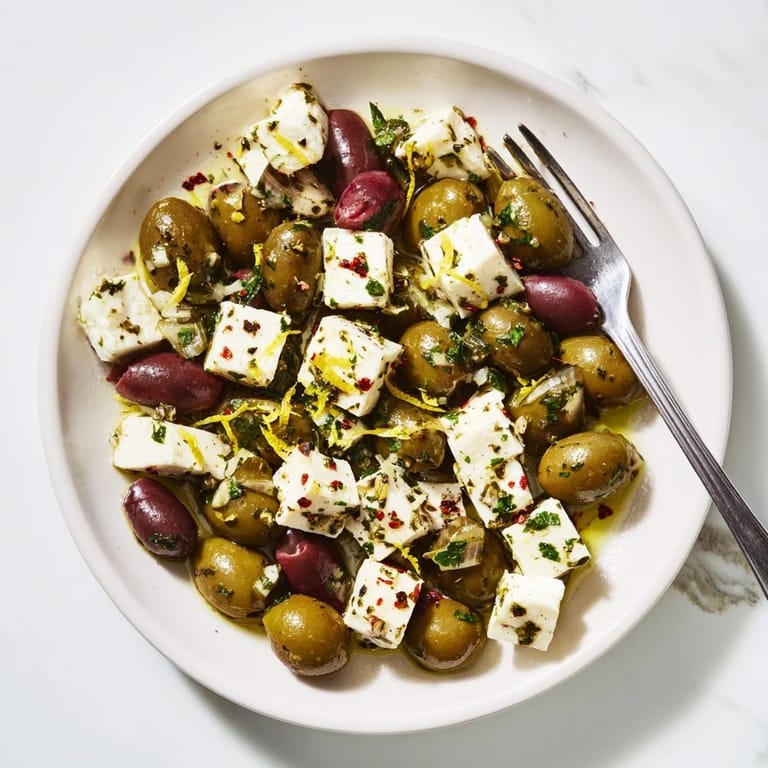 Pin it A vibrant and festive appetizer featuring a medley of marinated olives and creamy feta cubes, perfect for entertaining and holiday gatherings.