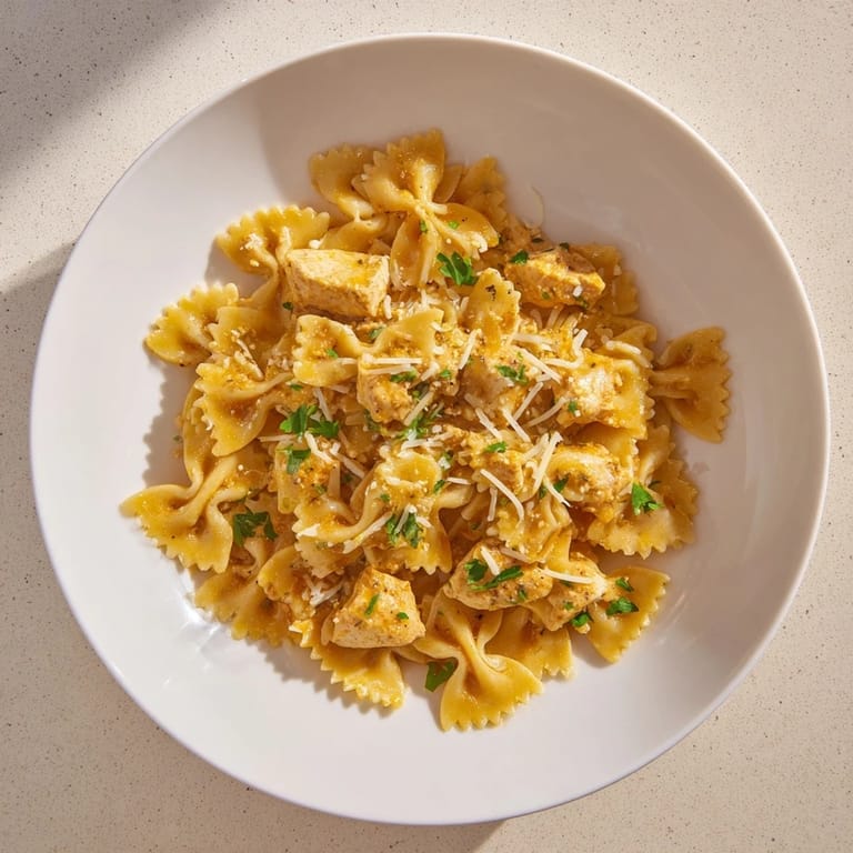 Pin it Tender chicken and bowtie pasta tossed in a rich garlic butter sauce, topped with melted mozzarella for a comforting and flavorful dish.