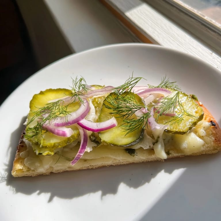 Pin it A tangy, creamy pizza topped with a rich crème fraîche sauce, mozzarella, and crunchy dill pickles. Perfect for adventurous pizza lovers seeking a unique flavor combination.