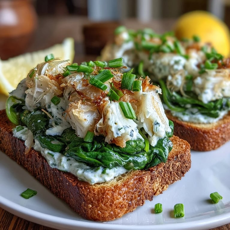 These smoked haddock and spinach rye toasts deliver a protein-rich breakfast in just 20 minutes. Gently poached haddock is flaked over buttery wilted spinach and creamy crème fraîche, all piled onto crisp rye toast. The combination of tender fish, earthy greens, and hearty bread creates a satisfying British-inspired morning meal. Finish with fresh chives and a squeeze of lemon for brightness.