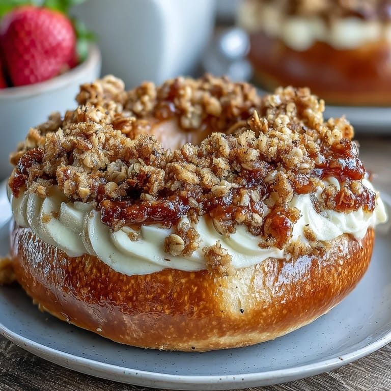 Pin it There's something quietly satisfying about pulling a tray of these bagels from the oven—the way the cheesecake filling peeks out from under the crumble, the smell of strawberries and vanilla filling your entire kitchen. It's the kind of breakfast that makes you feel like you did something nice for yourself.